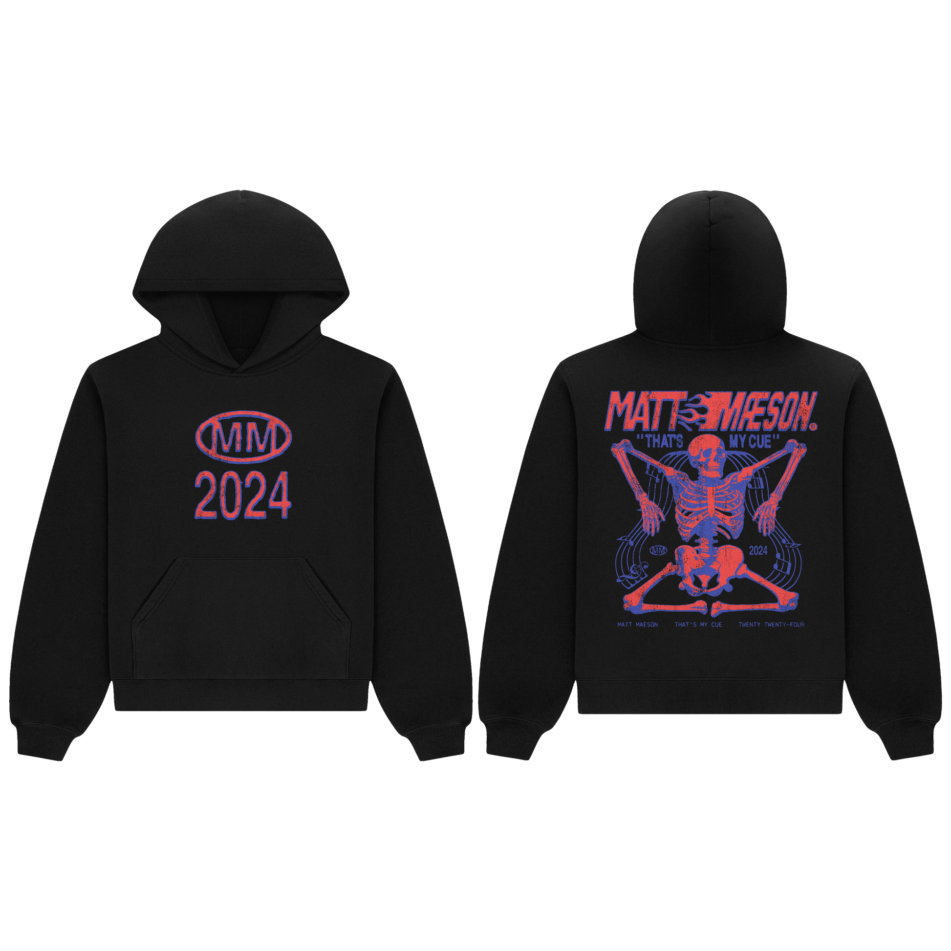 The That's My Cue Hoodie from Matt Maeson features a MM 2024 on the front and a large illustrated graphic on the back. This design is printed on a standard unisex black t-hoodie.